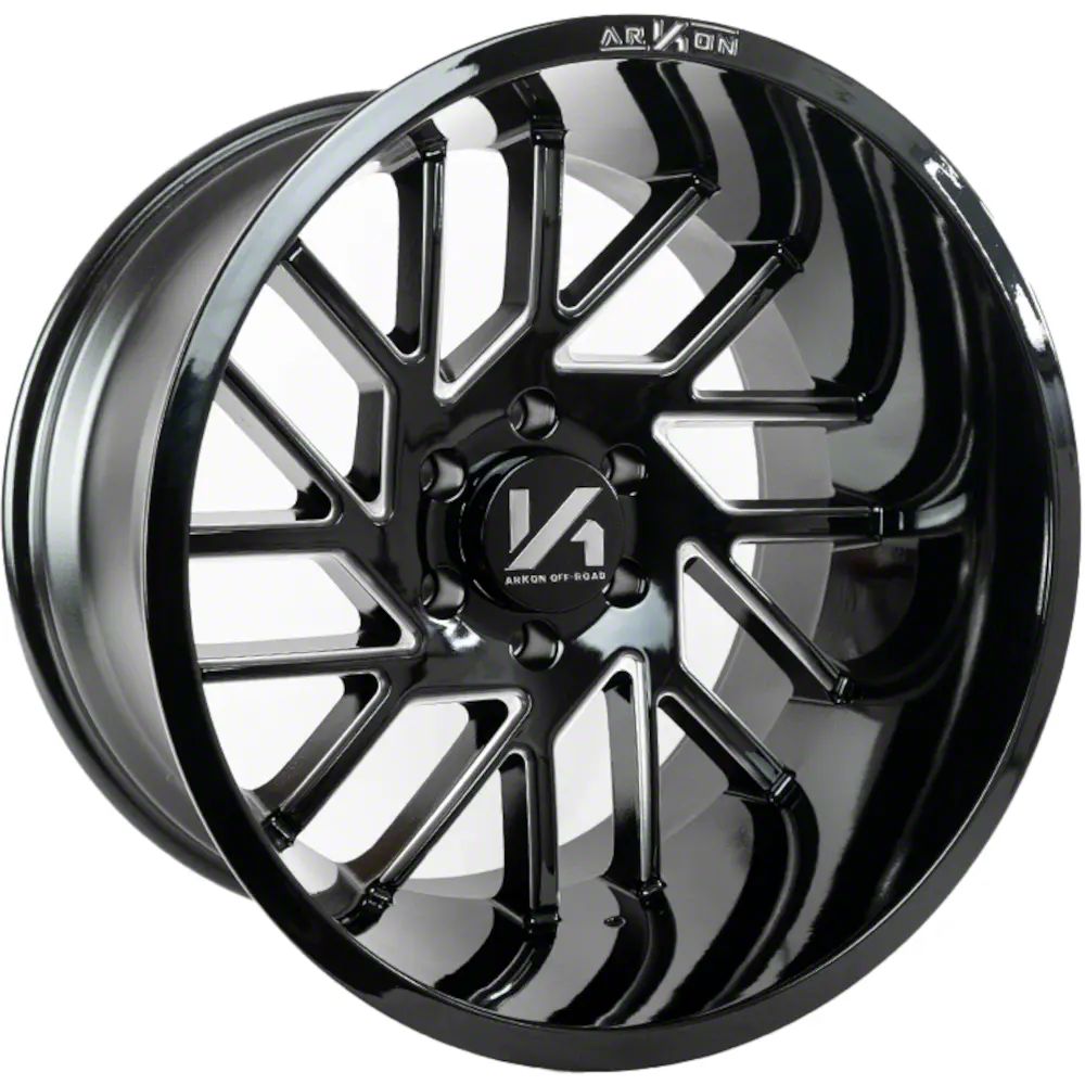Arkon Off-Road Mandela Gloss Black Milled 8-Lug 4-Wheel Kit; 20x12; -51mm Offset. The Arkon Off-Road Mandela Gloss Black Milled 8-Lug 4-Wheel Kit offers a striking balance of style and refinement. Its unique design accentuates the vehicle's aesthetic, while the premium construction underscores its robust nature. This wheel is a perfect choice for those seeking both elegance and a strong visual statement.