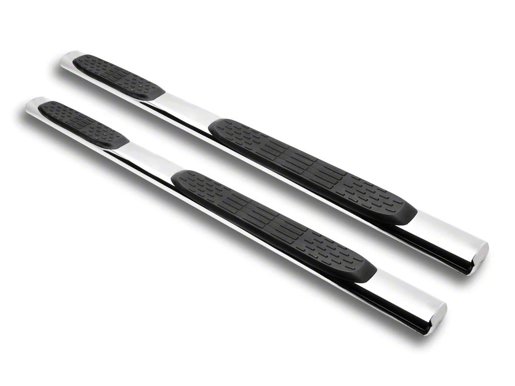 Construction and Appearance. Featuring a polished chrome finish, these side step bars come with matte black finish oval 5-inch step pads for secure footing. The extended tire coverage design offers additional protection against rocks, stones, and other road debris, keeping your vehicle's lower body in pristine condition.