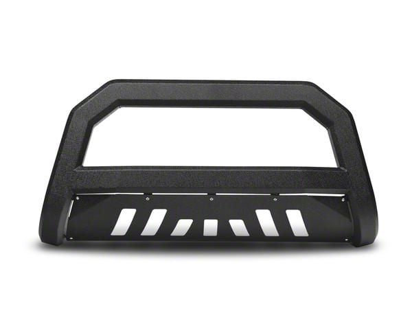 Heavy-Duty Build Quality. This bull bar assembly is manufactured from heavy-duty steel for superior durability. Additionally, this bull bar is machine-formed and expertly welded for added rigidity. Similarly, the integrated skid plate is made from a heavy gauge steel sheet and is precision-cut with slots, offering proper airflow. Finally, this assembly is finished in a tough and stylish textured black powder coating for added corrosion protection.