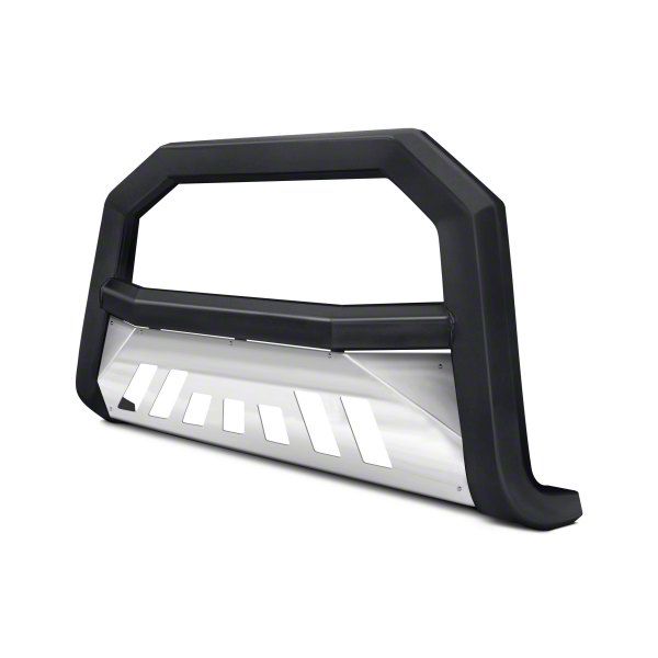 Construction and Appearance. Constructed from heavy-duty steel and finished in a textured black powder coat, this bull bar is corrosion-resistant and built to endure tough conditions. An integrated skid plate enhances undercarriage protection, while pre-drilled holes make it easy to install auxiliary lights for enhanced visibility.