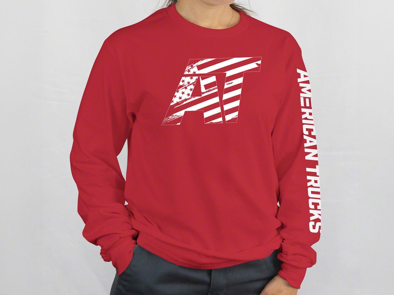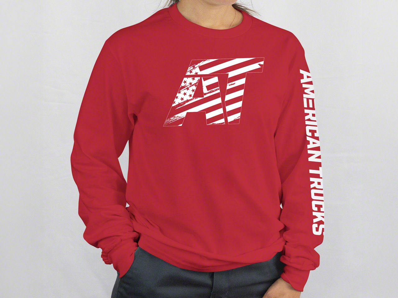 Show Your Appreciation. This AT Flag Long Sleeve T-Shirt is a great way to show the world your admiration and appreciation for American Trucks. Available from small through 2XL, this shirt has a strong American flag theme to display some patriotism.