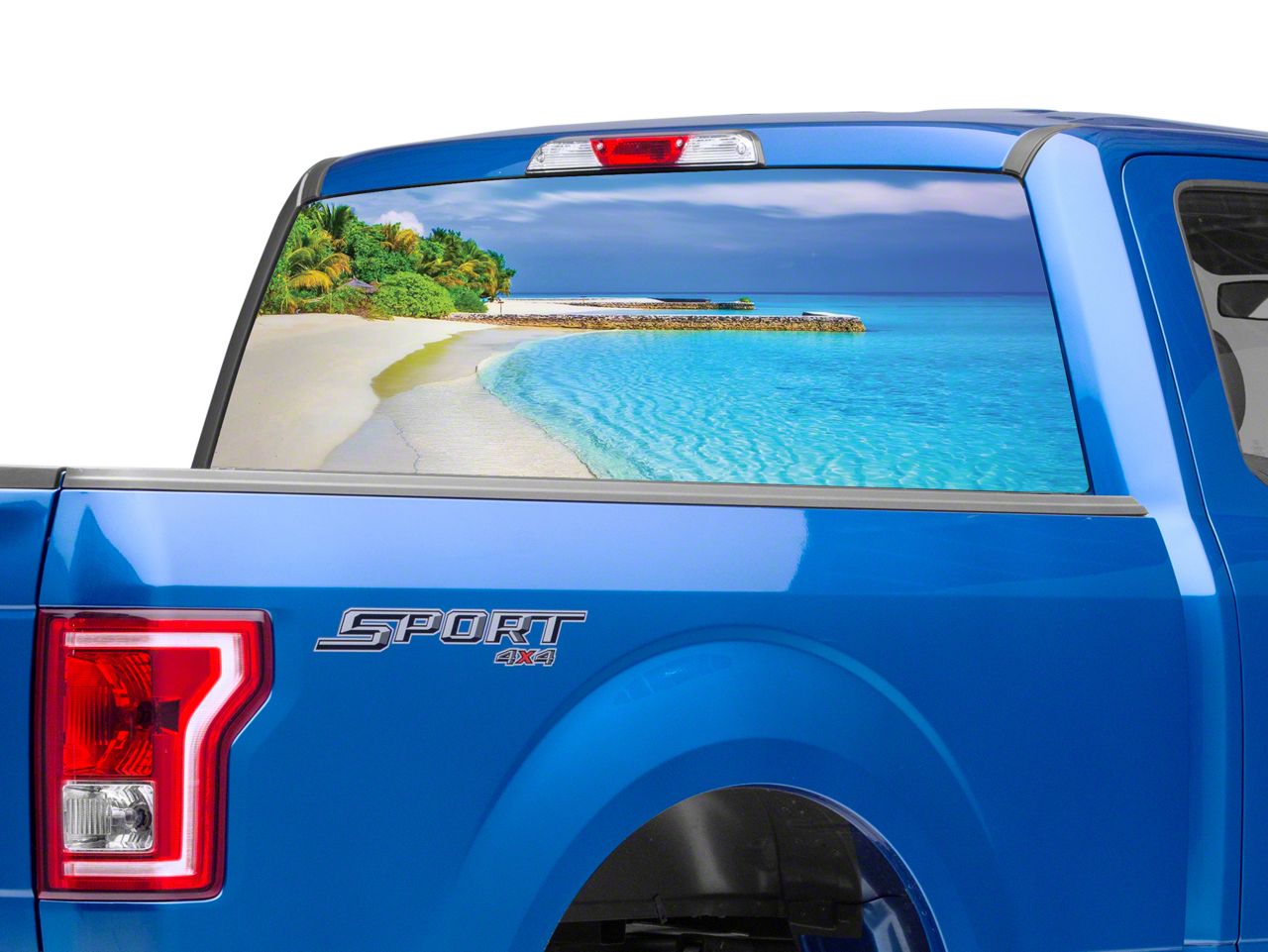 Application. This Perforated Tropical Beach Rear Window Decal will fit all 1997-2026 Ford F-150 models. Please note that this rear window decal is designed to be applied to the outside of the glass only, trimming is required for installation.
