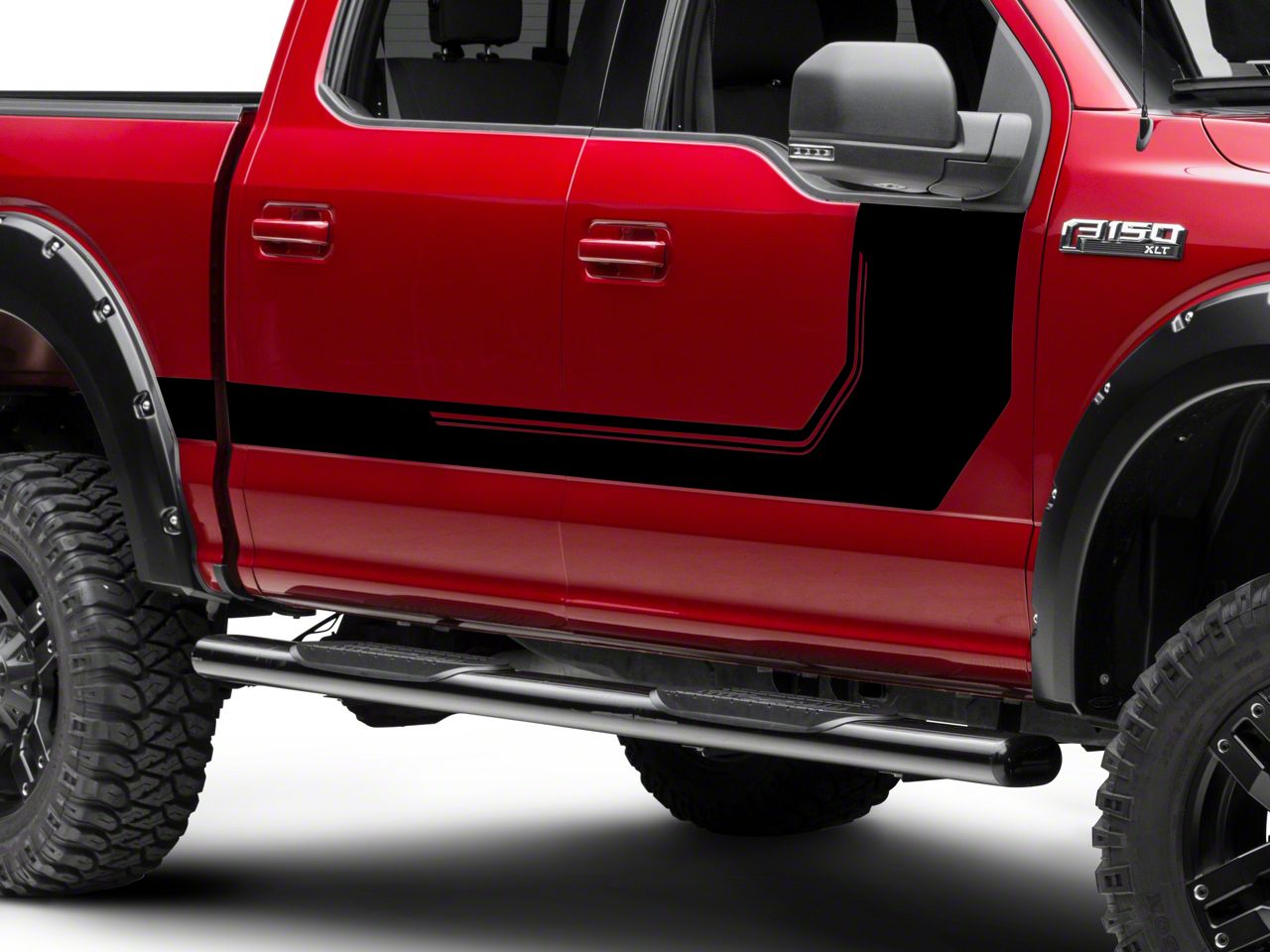 Sleek Appearance. Add personality to your F-350 with the black SEC10 Side Graphic. The black stripe adds flare to your Super Duty so it stands out from every other F-350 on the road. The side graphic running across the side starting from below the side view mirror and all the way to the rear wheel fender that truly makes it look fast when you're driving on the street.