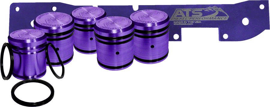 Construction and Appearance. This accumulator piston kit features anodized aluminum components finished in a distinctive purple color for corrosion resistance and visual identification. The kit includes five pistons manufactured with precision to ensure reliable sealing and performance within the transmission valve body.