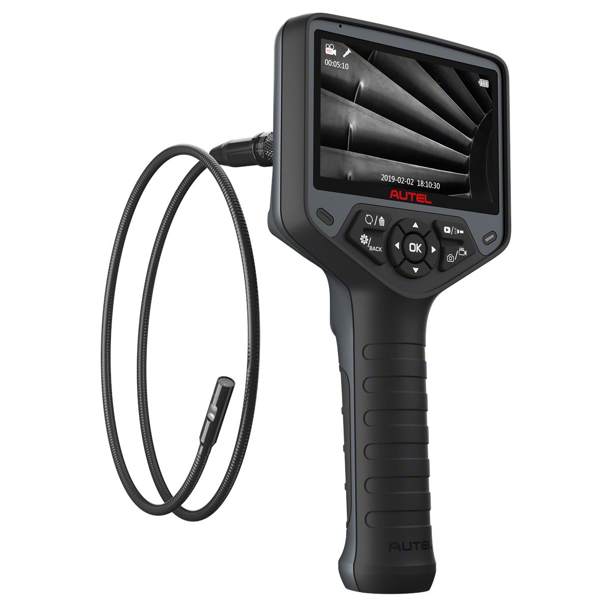 The MaxiVideo MV480 dual-camera digital videoscope is ideal for inspecting difficult-to-reach areas with its semi-rigid flexible 39.4-inch cable, 10-level adjustable LED light, and 70-degree field of view. The MV480 2-megapixel camera captures high resolution (1920 x 1080) stills and videos with 1-button quick image capture and video recording. The dual-camera 8.5mm probe provides front and side cameras that can be viewed independently or together for a wider viewing angle. The MV480 also features a new audio annotation function and bright LED flashlight on the back of the handle. The handheld unit features a 4.1-inch 1200x720 full color LCD display, and a built-in 2600 mAh battery with up to 4 hours of continuous use.