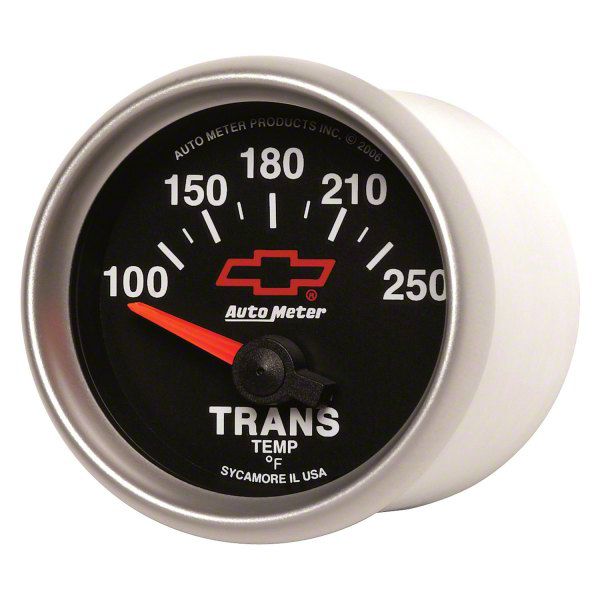Monitor Your Transmission Temperature. The Auto Meter Transmission Temperature Gauge with Chevy Red Bowtie Logo offers precise monitoring of your vehicle's transmission temperature. With a temperature range of 100-250°F, this gauge ensures your transmission operates within safe limits, preventing overheating and extending its lifespan.