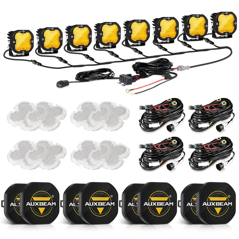 Features: Additional amber masks of personality modify your pods' color, get strong penetration color temperature for low visibility driving. It allows you to cut through dust, rain, snow, and fog to maintain maximum visibility.P8 LED chips with high intensity and perfect visibility, the perfect option for led driving light.TIR optics design collects all the light from LED improve beam pattern more focused and effective, reducing glare.Comes with 2 lead DT plugs wiring harness kit include fuse relay and switch all in a set, pretty easy and quick hook up.Rugged die-casting aluminum body designed for optimal heat removal, conquers rough off-road environments and resists corrosion.Impact-resistant polycarbonate lens. IP68 rated water-resistant.Specifications:Input Voltage: 12-30VPower: 80W/SETLumen: 9600M/PAIRLED CHIPS: P8*5LED Quantity(each): 5 PcsColor Temperature: 6000KWhite/3500K-AmberWaterproof Rate: IP68PCS/SET: 2PcsBuilt For Any Adventure:Auxbeam LED light pods are designed to be tough enough for a wide range of applications.Compatible with Trucks, Cars, Boats, SUV, UTV, ATV, Snowmobiles, Motorcycles, Dirt Bikes, 4x4...▶8-LED Pod Light Power Wiring Harness KitFeatures:Compatible: The wiring harness of the LED Pod Light is suitable for two-wire single mode only ON/OFF main light, and also includes the 8 in 1 2PIN DT Plug 40A fuse and relay. Built-in blade fuses to prevent overcurrent and short circuit to ensure the safety of the vehicle electrical system.Load Power: The wiring harness is included in a 3-meter 10AWG (5mm²) main wire and a DT-adapter plug with a total length of 1.5 meters, it can effectively overload the MAX 40A current, that is, the load power is 480W in the 12V.Plug and Play: The ultra-high quality features of the LED wiring harness kit make it a must-have tool for connecting any lights to your vehicle. The 8-Pod LED harness is easy to install, comes with 2 wires DT Plug and can be used for roof or bumper in your vehicle.Specification:Switch Wire Length: 3MInstall Pod Distance: 15cmDT-plug Adapter Length: 10cmDT-plug Connector: 2 PINWire Size: 10AWG National StandardWire Material: 5 mm² Copper WireWorking Voltage: 12V(Replaceable 24V relay)Package Included:8 x LED Pod Lights8 x Amber Lenses8 x Black Covers4 x Harness Kit DT Plugs1 x 8-LED Pod Light Power Wiring Harness Kit