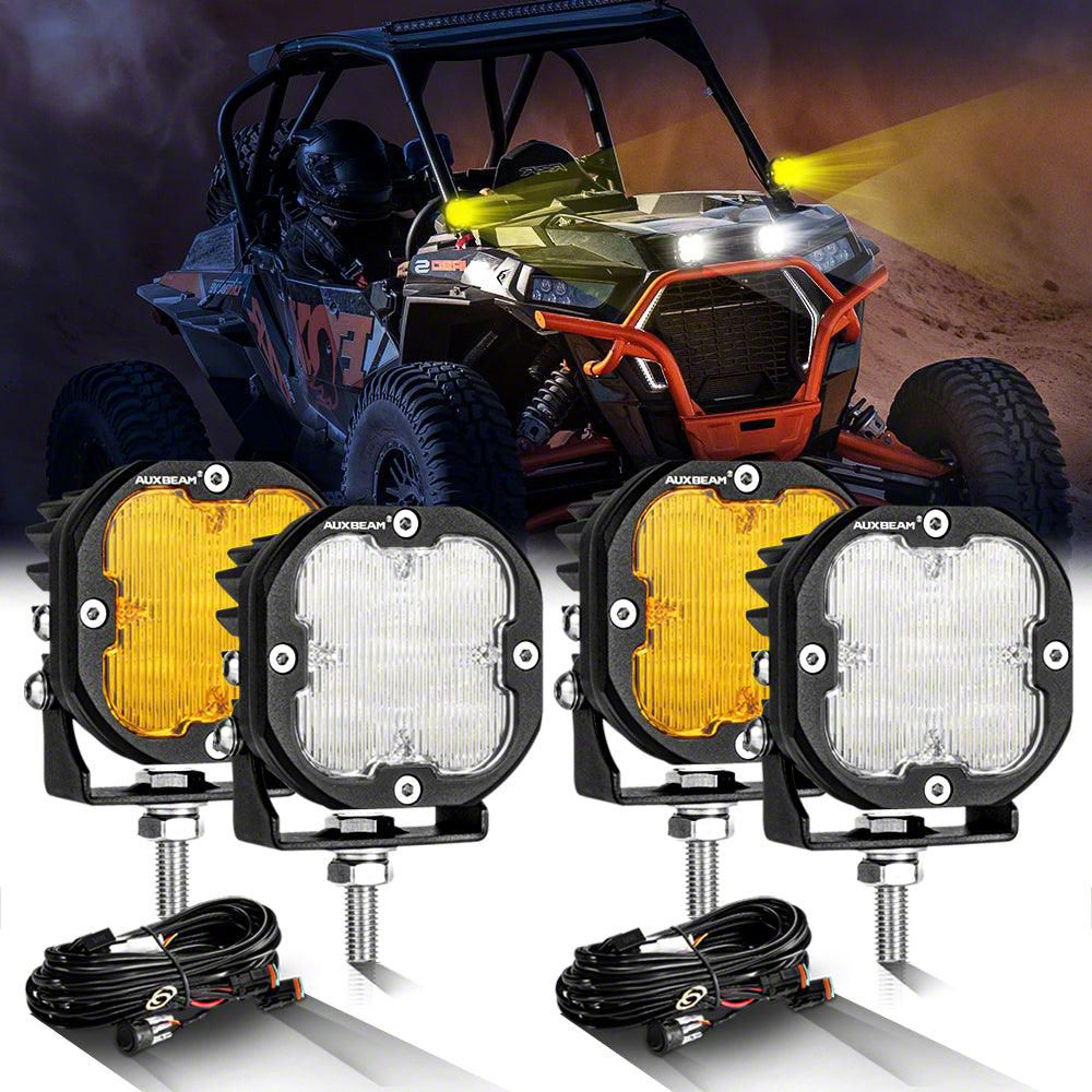 Features: Additional amber masks of personality modify your pods' color, get strong penetration color temperature for low visibility driving. It allows you to cut through dust, rain, snow, and fog to maintain maximum visibility.P8 LED chips with high intensity and perfect visibility, the perfect option for led driving light.TIR optics design collects all the light from LED improve beam pattern more focused and effective, reducing glare.Comes with 2 lead DT plugs wiring harness kit include fuse relay and switch all in a set, pretty easy and quick hook up.Rugged die-casting aluminum body designed for optimal heat removal, conquers rough off-road environments and resists corrosion.Impact-resistant polycarbonate lens. IP68 rated water-resistant.Specifications:Input Voltage: 12-30VPower: 80W/SETLumen: 9600M/PAIRLED CHIPS: P8*5LED Quantity(each): 5 PcsColor Temperature: 6000KWhite/3500K-AmberWaterproof Rate: IP68PCS/SET: 2PcsBuilt For Any Adventure:Auxbeam LED light pods are designed to be tough enough for a wide range of applications.Compatible with Trucks, Cars, Boats, SUV, UTV, ATV, Snowmobiles, Motorcycles, Dirt Bikes, 4x4...Package Included:4 x LED Pod Lights4 x Amber Lenses2 x Harness Kit DT Plugs