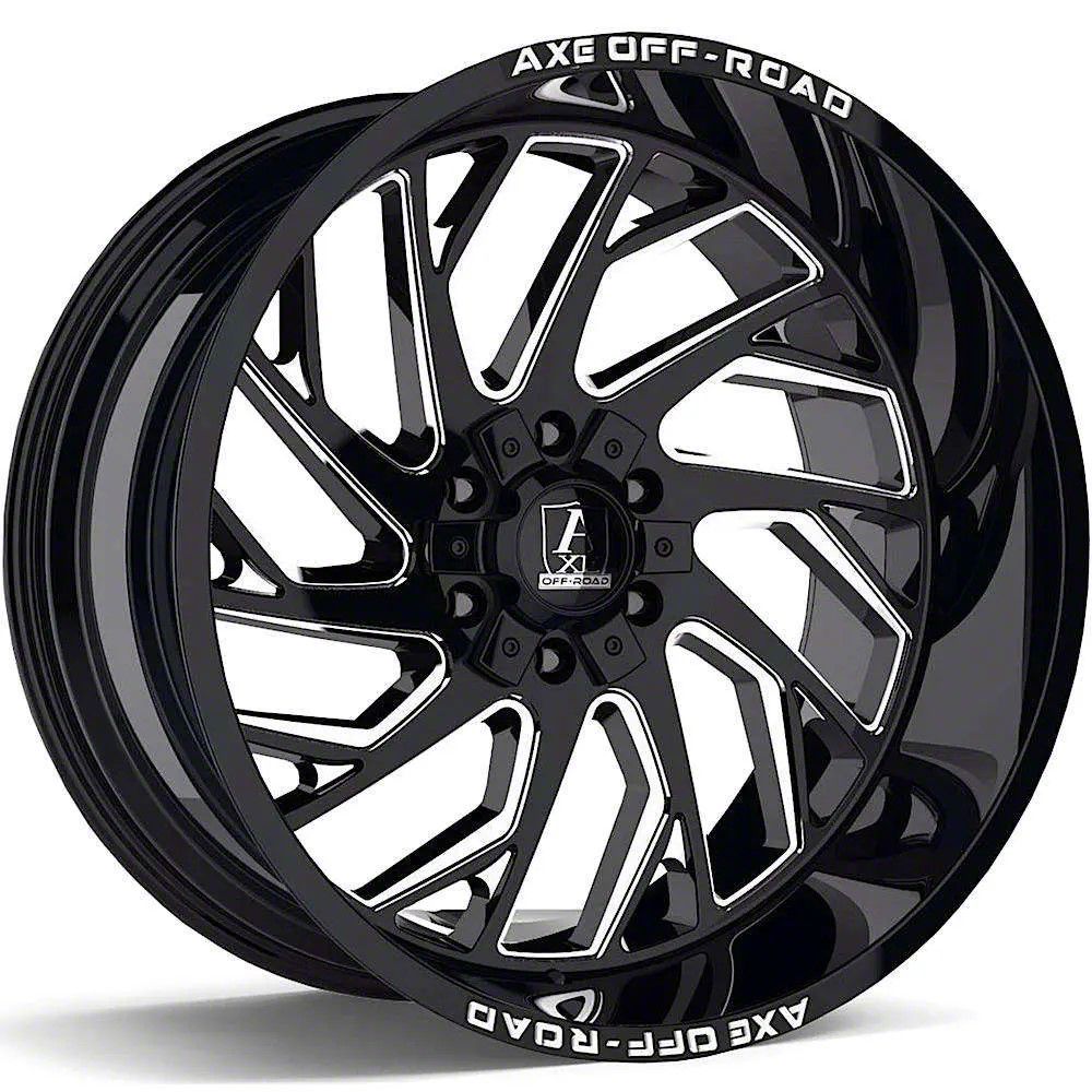 This 20x10 Axe Wheels Zeus Gloss Black Milled 6-Lug Wheel is completed in a high-quality gloss black finish with steel milled accents that will be the envy of everyone. There's a durable clear coat that protects against driving hazards.