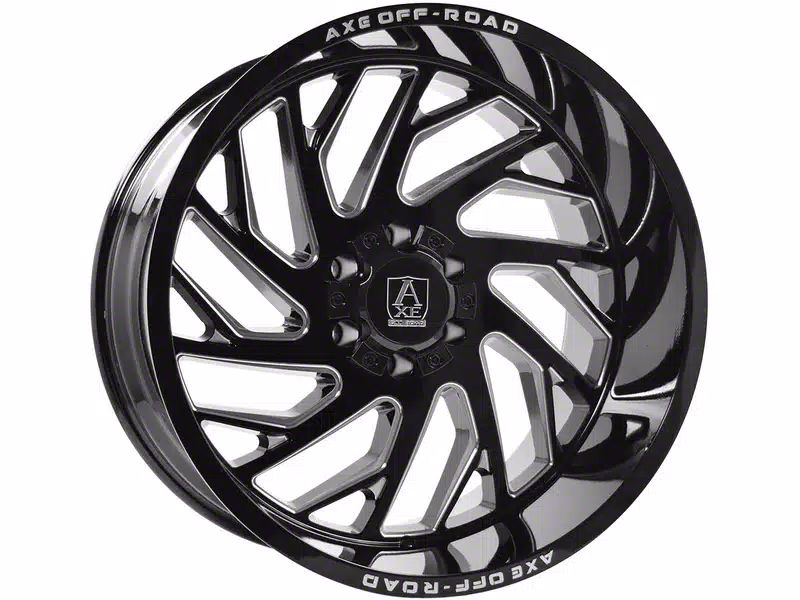 This 20x10 Axe Wheels Zeus Gloss Black Milled 6-Lug Wheel is completed in a high-quality gloss black finish with steel milled accents that will be the envy of everyone. There's a durable clear coat that protects against driving hazards.