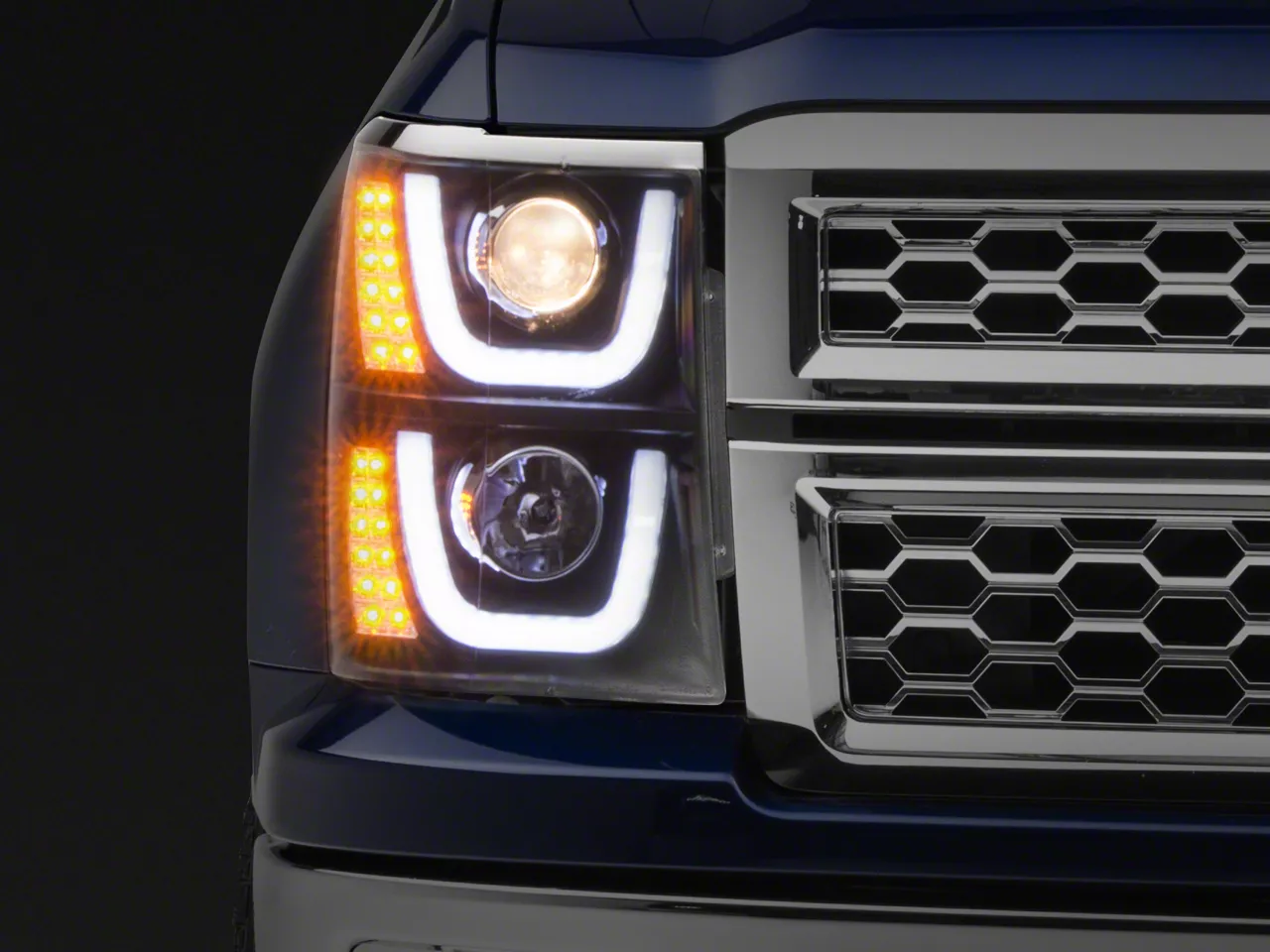 Application. These Black Dual U-Bar Halo Projector Headlights with LED Turn Signals are designed to fit 2014-2015 Chevrolet Silverado 1500 models. Driver and passenger side lights are included.