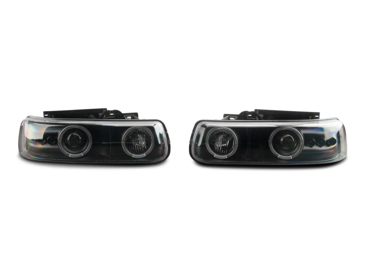 Application. These Black Projector Headlights with Dual LED Halos are designed to fit 1999-2002 Chevrolet Silverado 1500 models. Driver and passenger side lights are included.