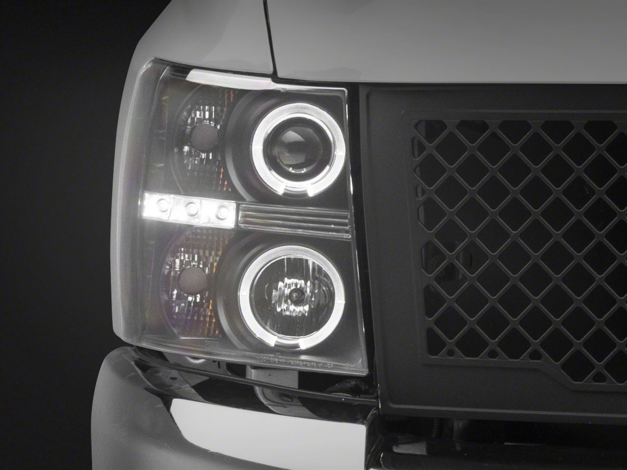 Modern Styling. A pair of Black Projector Headlights are a great way to update the exterior styling of your 2007-2013 Chevrolet Silverado. With a simple bi-level design, these black Headlights flow nicely with the lines of your Silverado's front end. These Projector Headlights feature LED accent halos that will give Silverado an updated modern appearance.