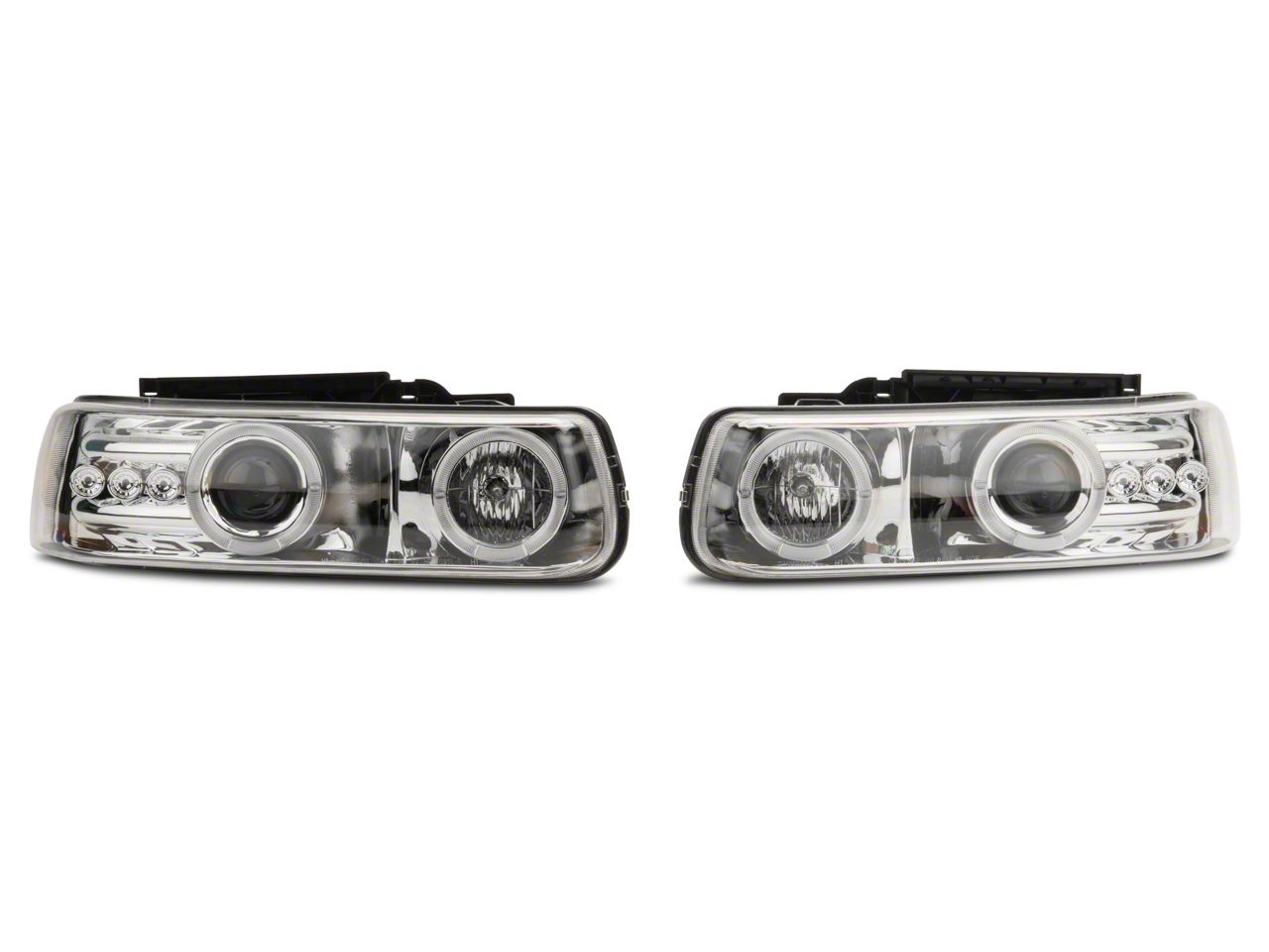 Application. These Chrome Projector Headlights with Dual LED Halos are designed to fit 1999-2002 Chevrolet Silverado 1500 models. Driver and passenger side lights are included.