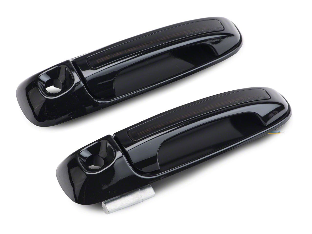 Low-Key LED Illumination. These Front Black Door Handles feature 12 amber LED wafers that give off subdued illumination under their smoke lens covers. They operate in conjunction with running lights and turn signals for a truly professional and street-legal look on the road.