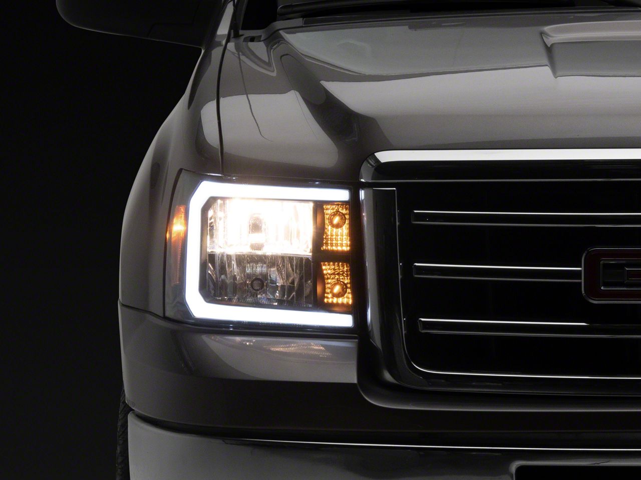 Application. These Axial Headlights with LED Bar; Black Housing; Clear Lens are designed to fit 2007-2013 GMC Sierra 1500 models. Driver and passenger side included. Reuses factory bulbs.