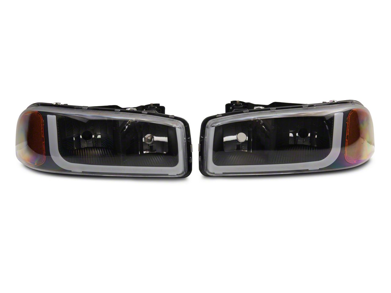Application. These Axial Headlights with Sequential LED Bar; Black Housing; Clear Lens are designed to fit 1999-2006 GMC Sierra 1500 models. Driver and passenger side included. Reuses factory bulbs.