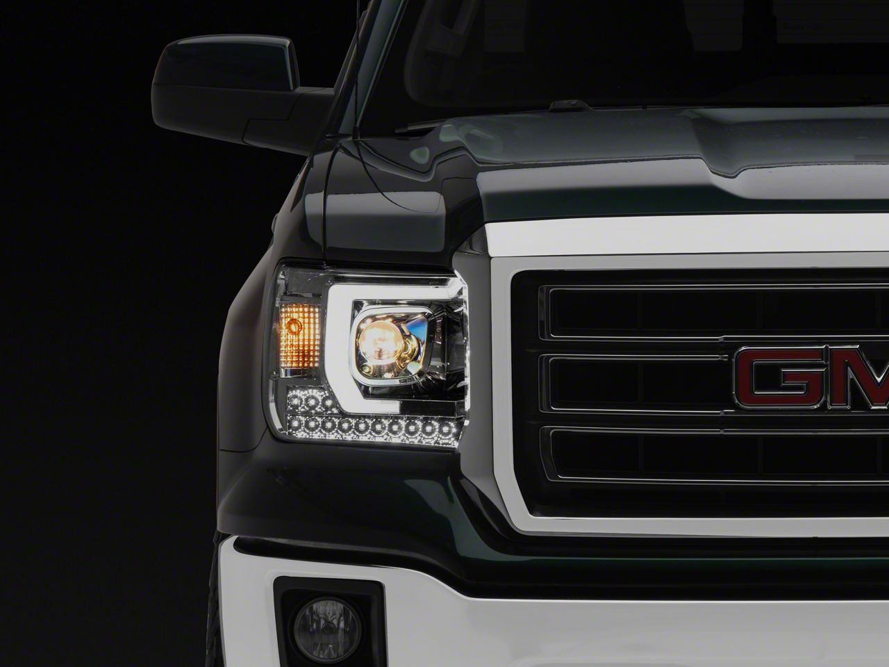 Contemporary Styling. Add an updated contemporary appearance to your 2014-2015 GMC Sierra 1500, all while improving your nighttime visibility with a pair of chrome Axial Projector Headlights. With impressive C-Bar style daytime running light (DRL) accents, these Headlights will give your Sierra a whole new look.