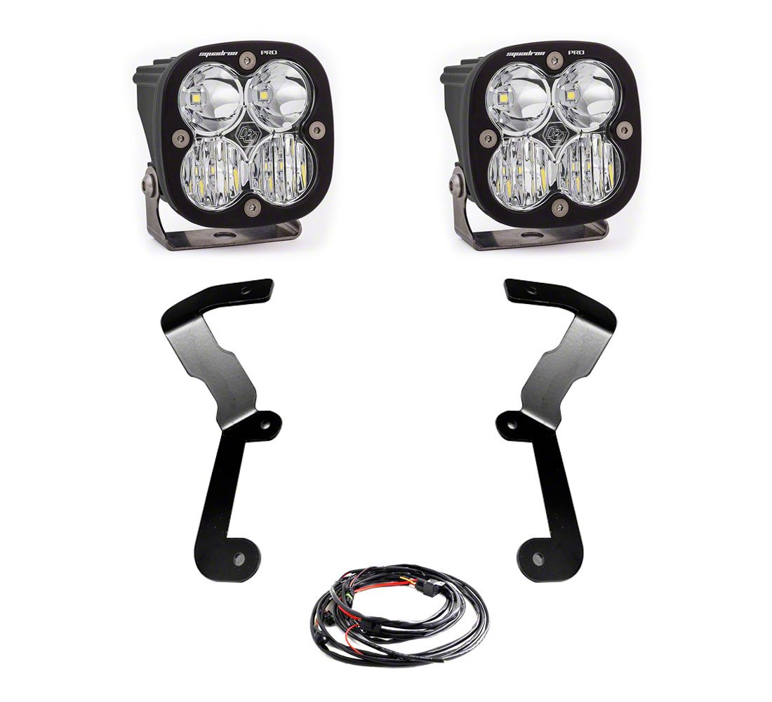 Enhanced Illumination. The Baja Designs Squadron Pro LED Lights with A-Pillar Mounting Brackets provide enhanced illumination, producing 4,095 raw lumens at 41 watts. These lights are designed to eliminate vibrations and are engineered to be waterproof, rainproof, and submersible.