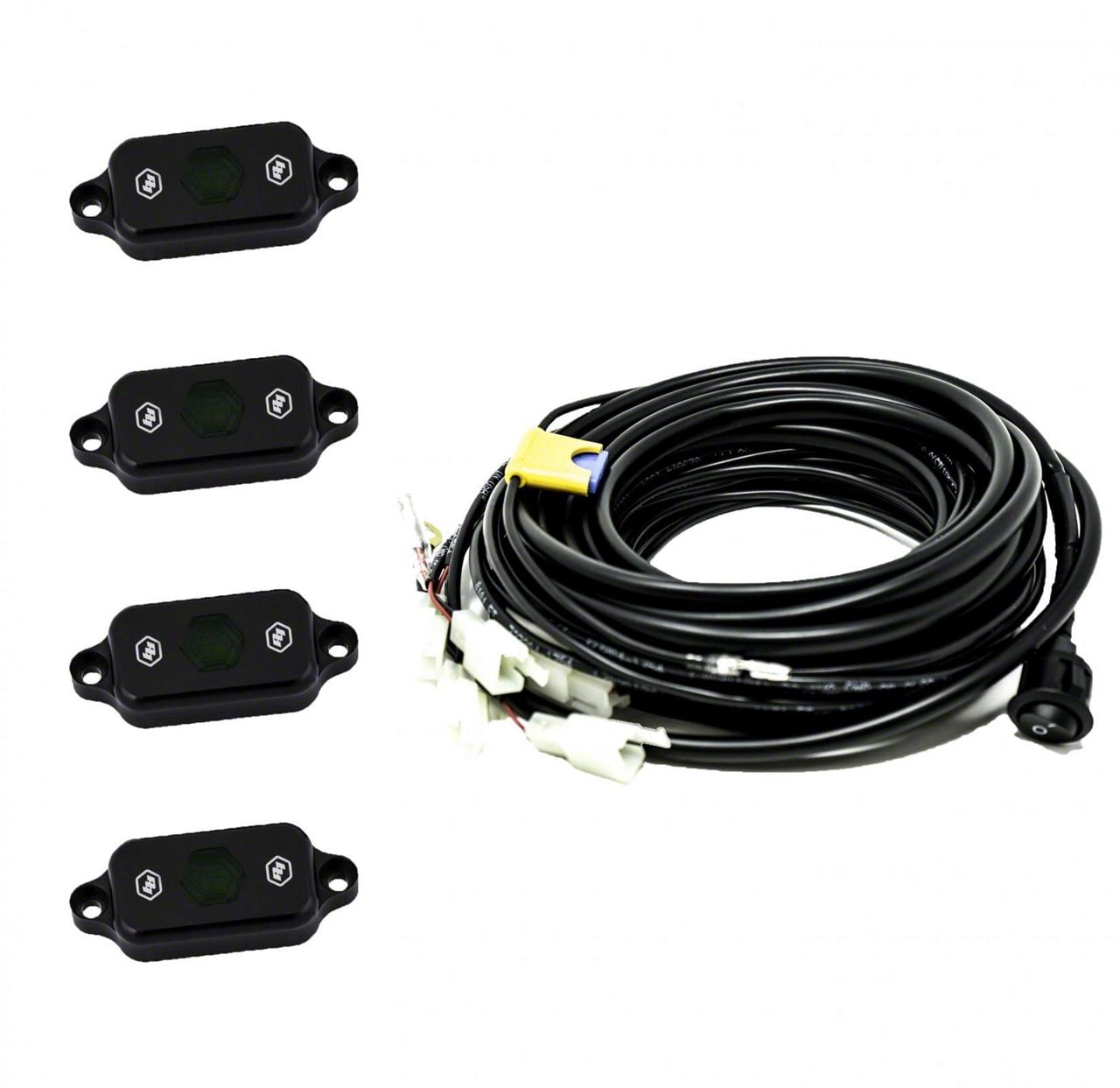 Our Universal Rock Light Kit takes the guess work out of buying wiring and trying to figure out how to pin relays. All of the lengths are pre-cut to reach all four corners of your small to mid-sized vehicle with some wiggle room on each lead to route the wiring any desired way. This kit includes four 400 lumen rock lights and wiring for a truly turn key kit. These LED lights are waterproof and can be mounted virtually anywhere. All that is needed is 12 volt power. They have a 180 degree optic to illuminate your wheel wells or anywhere else you need a bright and smooth light.