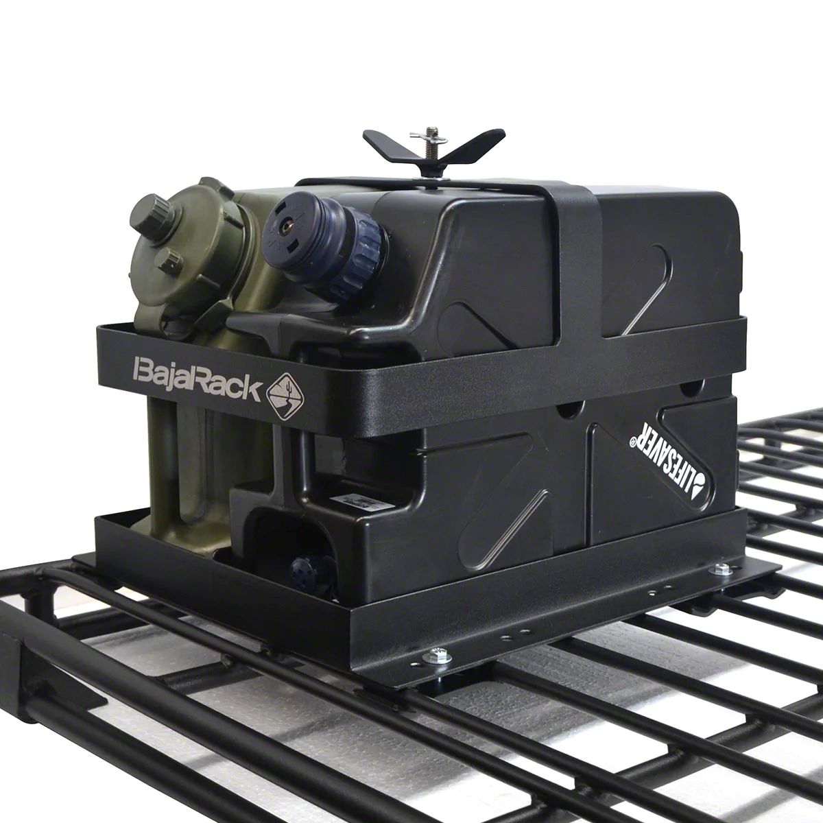 Application. A Baja Rack Roof Rack Water Can Holder Mount offers universal fitment.