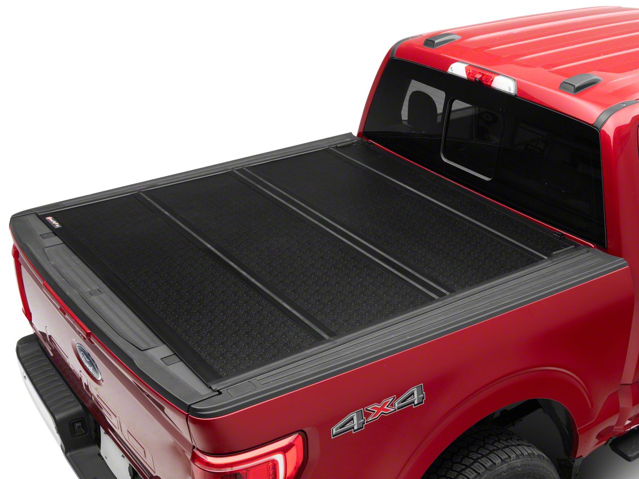 Simple Folding Design. With a low profile and a clever folding design, the BAKFlip F1 Tri-Fold Tonneau Cover from Bak Industries is a simple to operate truck bed cover. It can easily be folded up all the way to the cab of your F-150, allowing full access to the truck bed. The cover features an integrated slam latch locking system that complements the bed rail clamps, giving you resilient, all-round protection to the content in your F-150 bed.