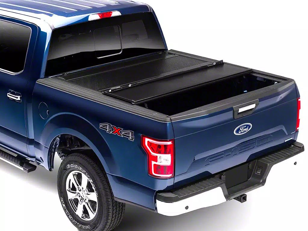 Conveniently Foldable. This BAKFlip FiberMax Tri-Fold Tonneau Cover can be flipped using just one hand, thanks to the quick-release, slam latch system. Its closed configuration allows full rear visibility and its flipped position does not obstruct the third brake light. The durable buckles and prop rods offer tight support to keep the cover in its partially closed and fully-opened positions.