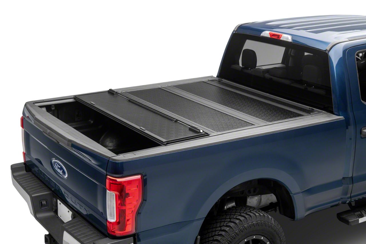 Practical and Stylish Modification. The BAK Industries BAKFlip F1 Tri-Fold Tonneau Cover offers a practical way to keep the truck bed of your Super Duty protected from the harsh weather and your cargo concealed from possible theft. This bed cover features a segmented, hard, and durable construction that can be folded accordingly if you need to haul large items.