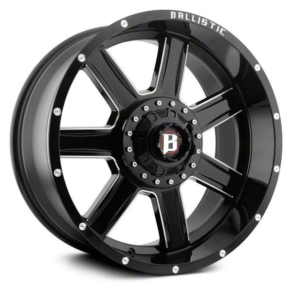 This 22x10 Ballistic Yukon Gloss Black Milled 6-Lug Wheel is completed in a high-quality gloss black finish with steel milled accents that will create a striking appearance. There's a durable clear coat that protects against driving hazards.