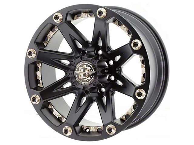 Ballistic Jester Flat Black with Camouflage Accents 5-Lug Wheel; 20x9; -12mm Offset exudes sophistication with its finish, offering a sleek and modern appeal to any vehicle it adorns. The design is meticulously crafted to enhance the aesthetic of your vehicle, giving it a distinctive and upscale look. Perfect for those seeking to elevate their vehicle's style, this wheel blends seamlessly with both contemporary and classic vehicle designs, making it a versatile choice for a wide range of vehicles. Its robust construction ensures durability, making it a reliable choice for drivers who value both style and quality.