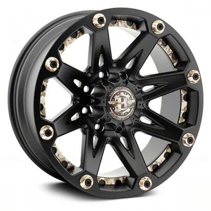 Ballistic Jester Flat Black with Camouflage Accents 8-Lug Wheel; 17x9; 12mm Offset. The Ballistic Jester Flat Black with Camouflage Accents 8-Lug Wheel offers a striking balance of style and refinement. Its unique design accentuates the vehicle's aesthetic, while the premium construction underscores its robust nature. This wheel is a perfect choice for those seeking both elegance and a strong visual statement.