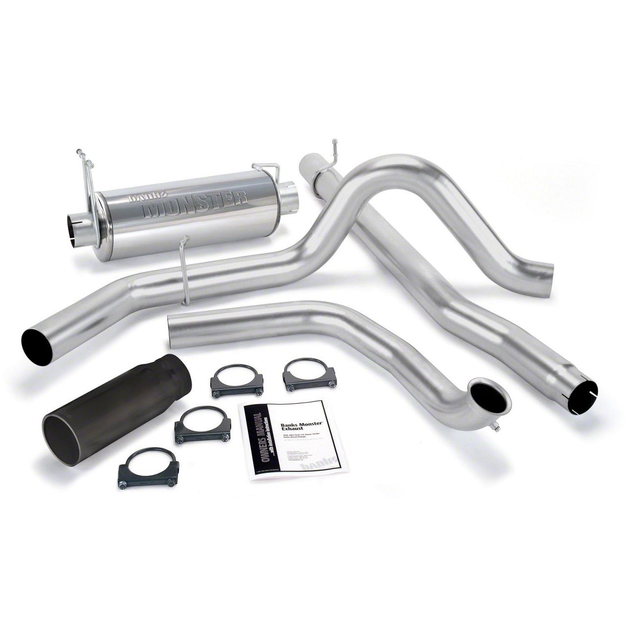 4-inch constant-diameter pipes with Straight-thru muffler cuts back pressure up to 81 Percent. Turbo Back System. 5-inch Cerakote Black tip. F-250 and F-350 Pickups and Excursions: Banks 4 inch Monster turbo-back stainless steel exhaust features streamlined turbine-outlet pipe, intermediate pipe and tailpipe all formed of stainless, heavy-wall tubing with constant-diameter bends to maximize flow, lower exhaust gas temps and slash backpressure up to 81 percent. (Available with or without a cast, large-bore Power Elbow housing). Designed to retain stock catalytic converter. The polished-stainless Monster muffler features a straight-through 4 inch diameter flow-path with a Banks-designed expansion chamber to dissipate the annoying mid-range exhaust drone that affects most straight-through designs. The muffler utilizes spun ceramic, very-high-temperature packing, more than doubles stock exhaust flow, and delivers an authoritative - but never intrusive - exhaust sound. And the 5 inch polished rolled-edge tip has an adjustable clamp for positioning on tailpipe. Get it in your choice of chrome-over stainless or high temp black! See this system with the Black tip and no Power Elbow. (And to help keep it looking good, there's a 1/2 inch air gap to keep heat from tarnishing the finish). Important: Some vehicle configurations require an extension kit for proper fit. Pickups other than standard-cab long-bed or extended-cab short-bed require Exhaust Extension Kit. Extended Cab Long Bed P/N 53517 required, Crew Cab Short Bed P/N 53516 required, Crew Cab Long Bed P/N 53518 required. Monster Exhaust System, Single Exit, Black Round Tip for use with 1999 Ford 7.3L, Truck, Catalytic Converter
