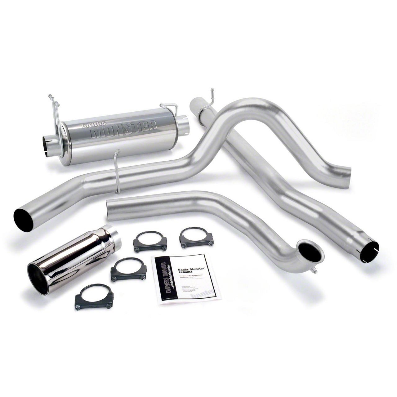 High-Performance Exhaust System. The Banks Power Monster Single Exhaust System with Chrome Tip is designed to enhance the performance of your 7.3L Powerstroke. By reducing backpressure by up to 81%, this system significantly improves exhaust flow, resulting in increased power and efficiency. It also lowers exhaust gas temperatures, which helps extend engine longevity. The straight-through muffler design delivers a deep, authoritative exhaust note without excessive noise.