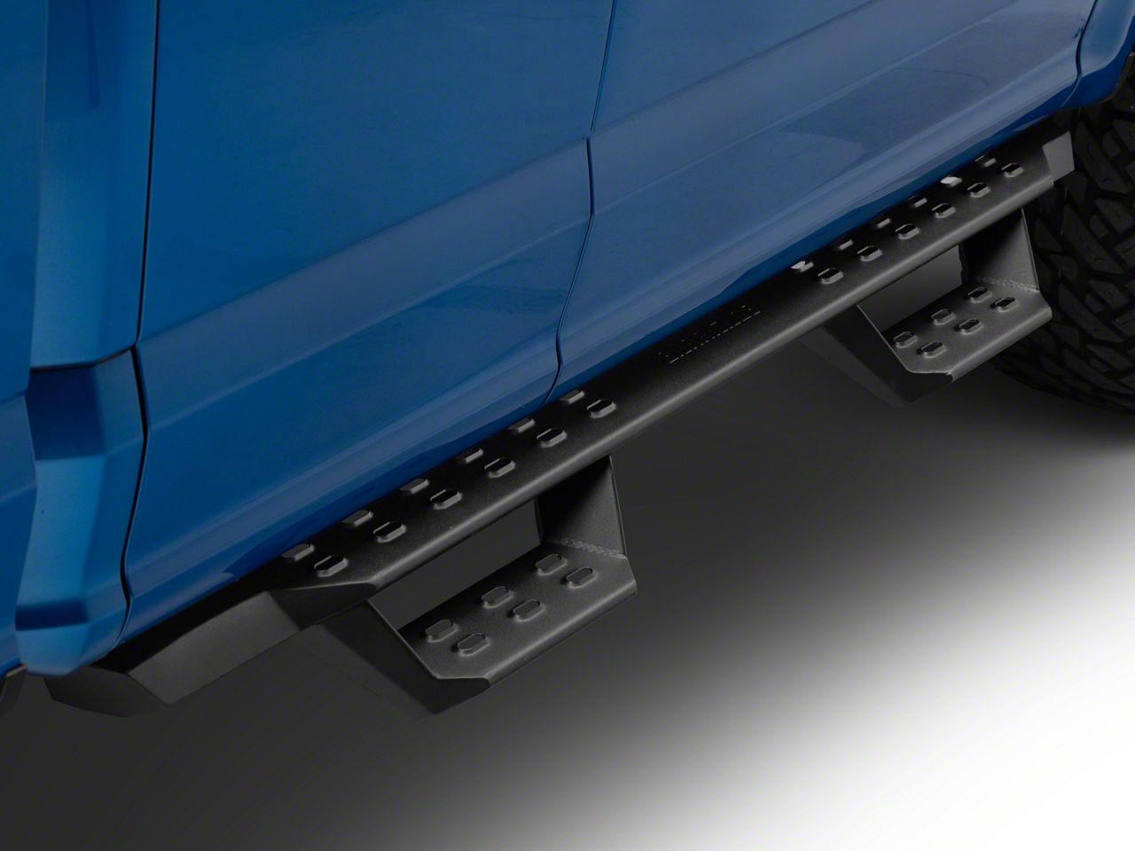 Function and Style. Get in and out of your Ford F-150 SuperCab with ease by installing a set of Barricade's HD Overland Drop Side Step Bars. With an angular drop stepped design, these black textured Side Steps not only provide easy entry into your lifted Ford, but they also give your F-150 a rugged off-road appearance. As an added bonus, these HD Overland Drop Side Step Bars can provide additional protection from both road and trail hazards.