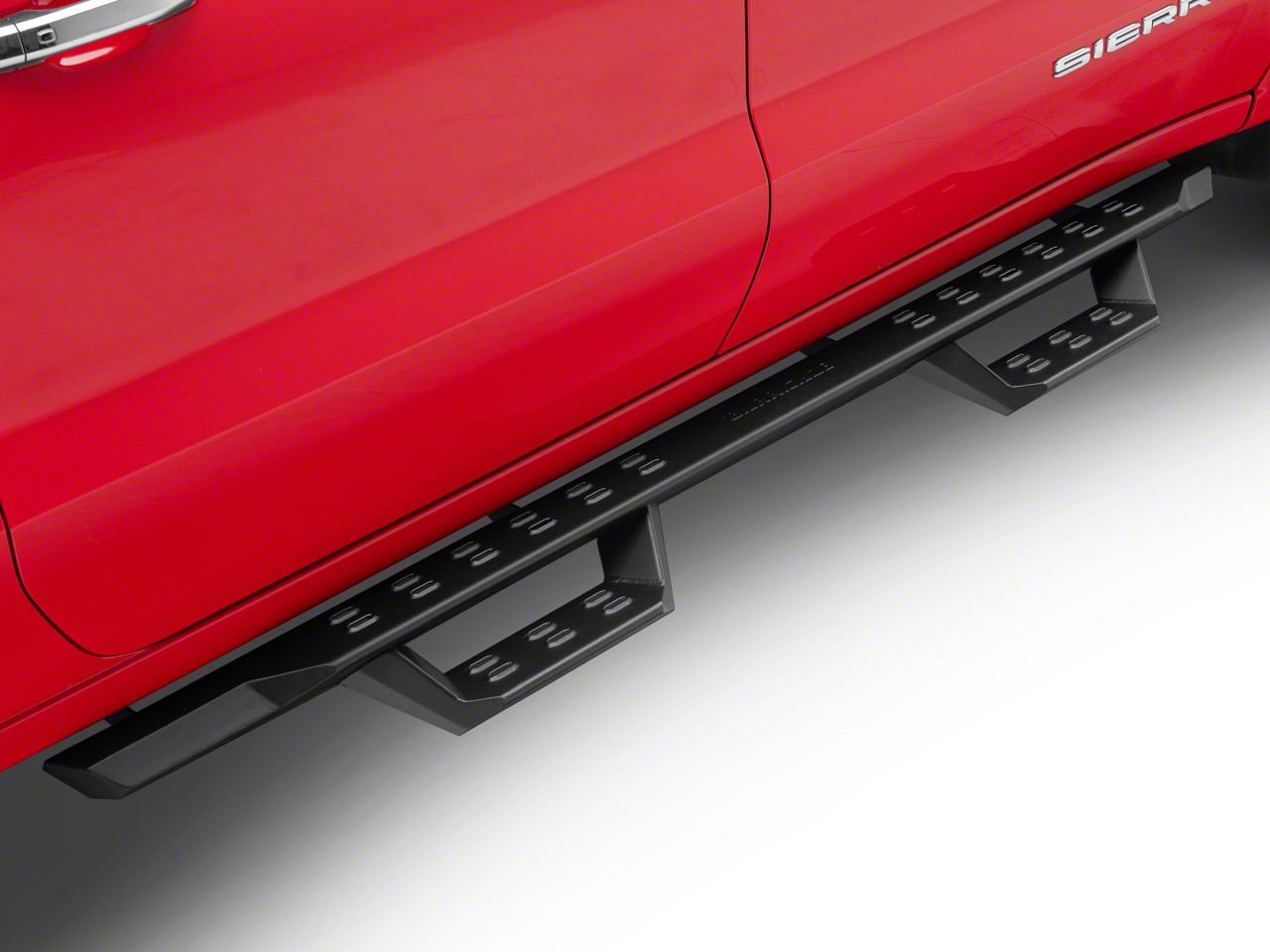 Function and Style. Get in and out of your GMC Sierra 1500 Crew Cab with ease by installing a set of Barricade's HD Overland Drop Side Step Bars. With an angular drop stepped design, these black textured Side Steps not only provide easy entry into your lifted GMC, but they also give your Sierra a rugged off-road appearance. As an added bonus, these HD Overland Drop Side Step Bars can provide additional protection from both road and trail hazards.