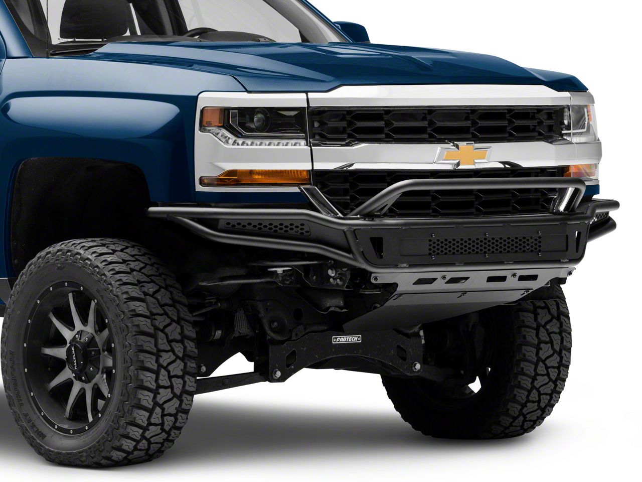 Rugged Front-End Protection. Add rugged pre-runner styling to your 2016-2018 Chevrolet Silverado by upgrading to a Barricade Off-Road Pre-Runner Front Bumper. Designed with the aggressive off-roader in mind, this Bumper features an integrated grille guard hoop and skid plate. Additionally this Bumper includes 2 grille covers, 1 with a mesh honeycomb pattern and the other open for use with a light bar - light bar not included, sold separately. Loaded with all these great features, this Barricade Pre-Runner Front Bumper is ideal for both street and off road use.