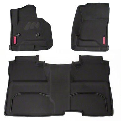 Application. The BaseLayer Custom-Fit All Weather Front and Rear Floor Liners with Red Logo fit 2014-2018 Sierra 1500 Crew Cab models.