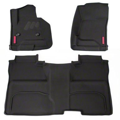 Durable All-Weather Protection. The BaseLayer Custom-Fit All Weather Front and Rear Floor Liners with Red Logo provide comprehensive protection for your GMC Sierra 2500 HD Crew Cab's interior. Designed to handle mud, water, and debris, these liners maintain a clean cabin while enhancing the aesthetics with their sleek black color and subtle red logo.