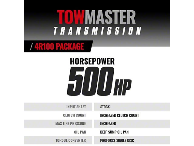 High-Performance Towing and Street Transmission Package. The BD Power Towmaster 4R100 Transmission and Converter Package with Billet Input Shaft is designed to enhance the performance and durability of your vehicle beyond stock capabilities. This package delivers dyno-proven power, increased drivetrain longevity, and improved fuel efficiency. It is an excellent choice for street and towing applications, offering a lower RPM response and enhanced stall for optimized power transfer.