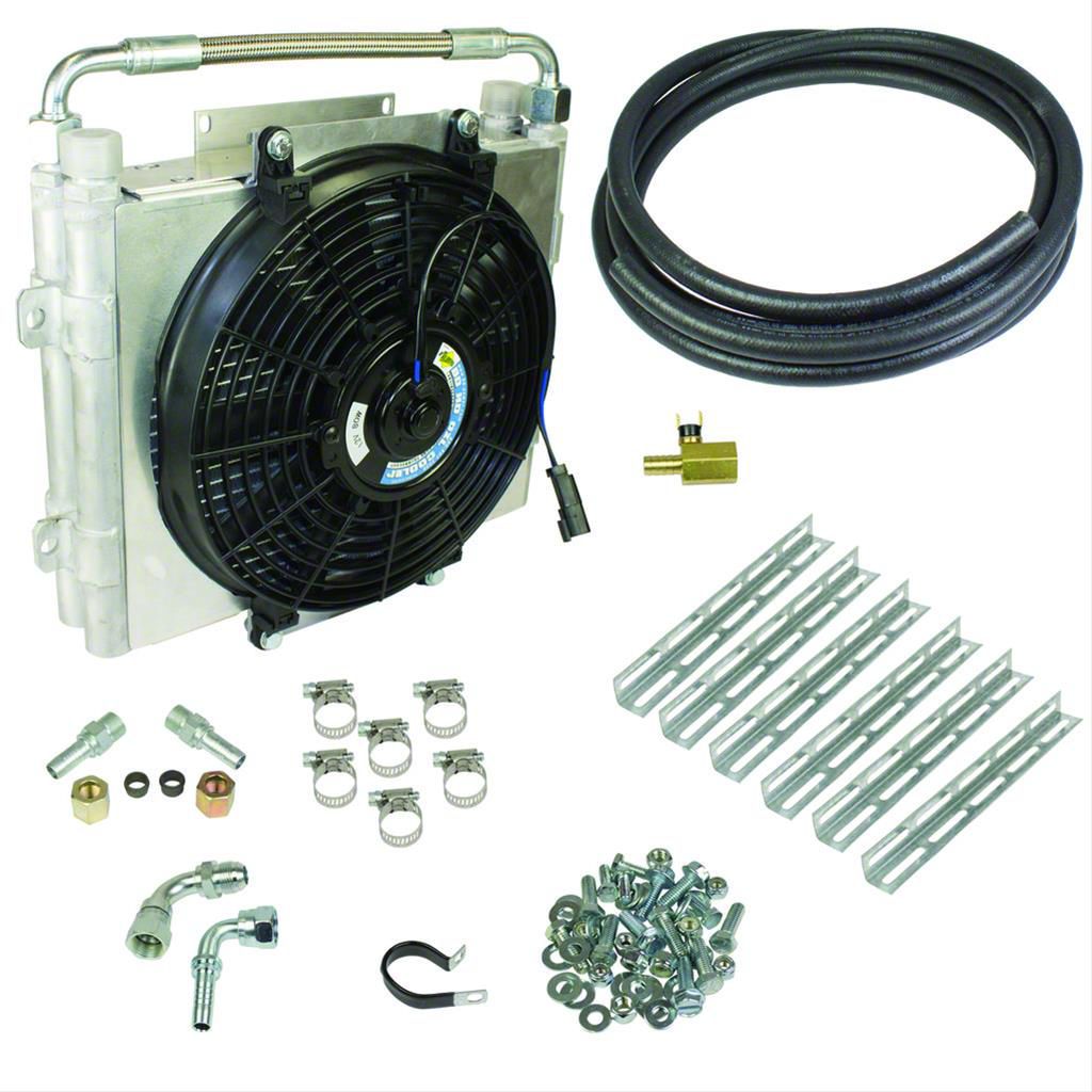 Construction and Appearance. Constructed with double stacked cores, this transmission cooler can dissipate over 40,000 BTU/HR. It features furnace brazed rails tested to 300psi, large 5/8-inch ports to prevent inlet/outlet restriction, and a large surface area for optimal heat transfer. The cooler is equipped with an 80-watt, 10-inch electric fan, thermostatically controlled for efficient cooling.