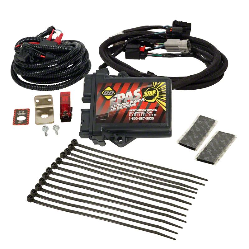 Like a fire extinguisher in your house, or an earthquake kit, it's always better to be prepared. Although rare, Diesel Engine Runaway is caused when external hydrocarbons are drawn into the engine and can cause overspeeding and catastrophic engine failure. Life, limb and your vehicle are put in jeopardy. BD Diesel Performance has you covered should the worst happen with our Electronic Positive Air Shutdown (E-PAS) units by cutting the intake air supply to the cylinders and safely shutting down the engine. The E-PAS controls the electronic throttle body in the intake manifold found on most late model diesel engines by closing it to shut off the air supply in emergency situations. The E-PAS can be easily installed in less than 1.5 hours with factory plug-in connectors and premade wiring harnesses. Automatically resets itself after shutdown and can be easily removed for truck lease returns.