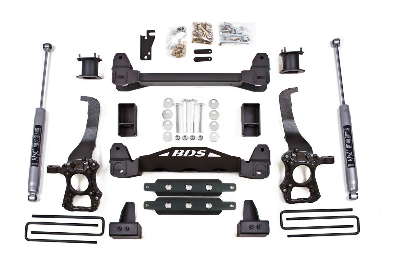 Application. The BDS 4-Inch Suspension Lift Kit with Rear Lift Blocks and NX2 Nitro Shocks is compatible with 2014 2WD F-150 models.