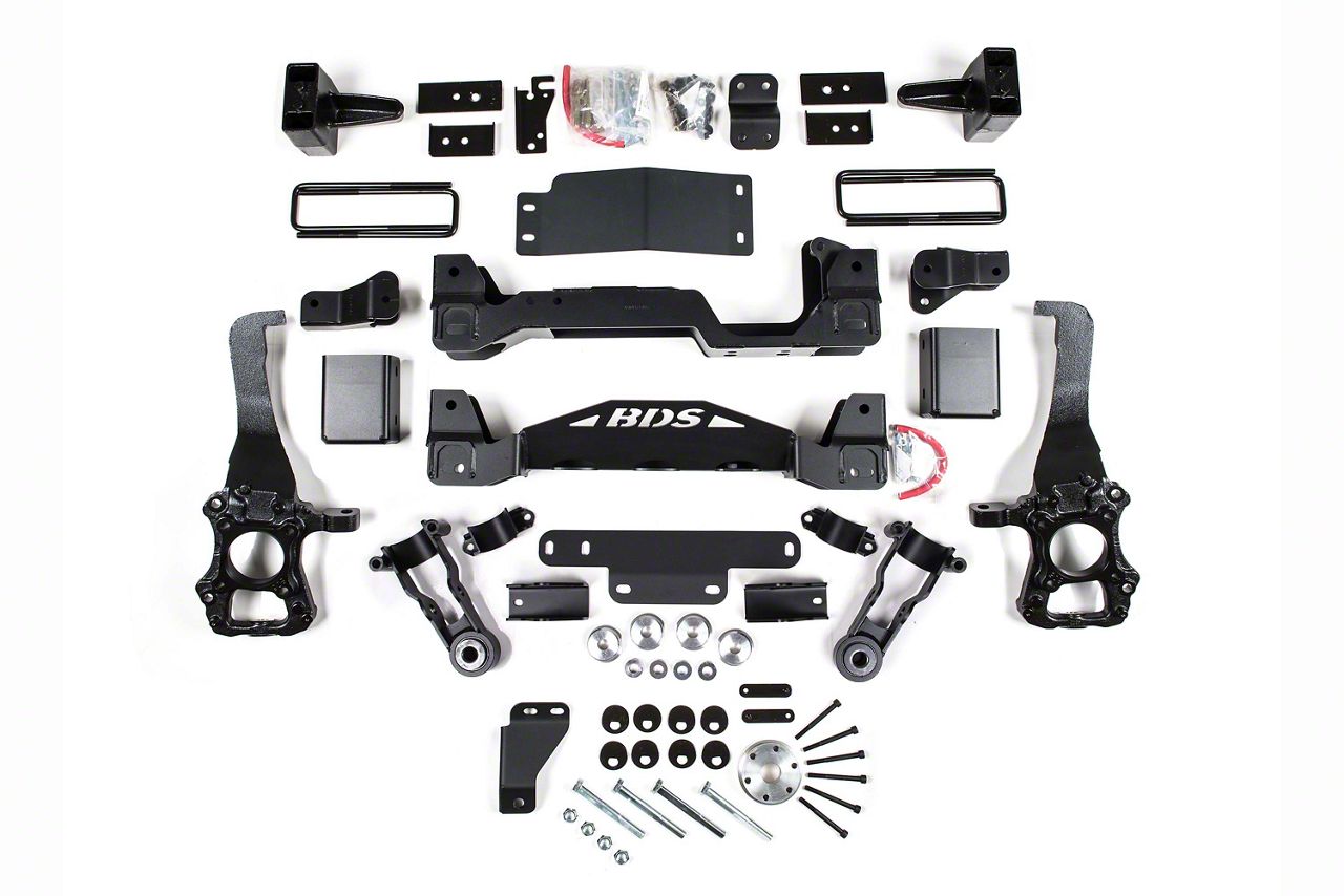 Performance Boost. Conquer the rough terrains by enhancing your Ford F-150’s off-road capabilities with this BDS 4.50-Inch Suspension Lift Kit. This suspension system transforms your truck with an aggressive stance, increased ground clearance, and superior off-road performance. It features a high clearance crossmember and steering knuckles that keep everything tucked in. With BDS’s premium components, you can accommodate larger tires and experience smoother ride quality wherever you take your Raptor.