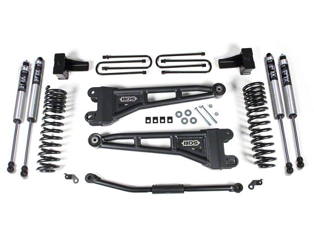 Application. This BDS 2.50-Inch Radius Arm Suspension Lift Kit with 4-Inch Lift Blocks and FOX 2.0 Performance Shocks is designed to fit 2011-2016 4WD F-250 Super Duty models with the 6.7L Powerstroke engine and without top mounted overload springs.