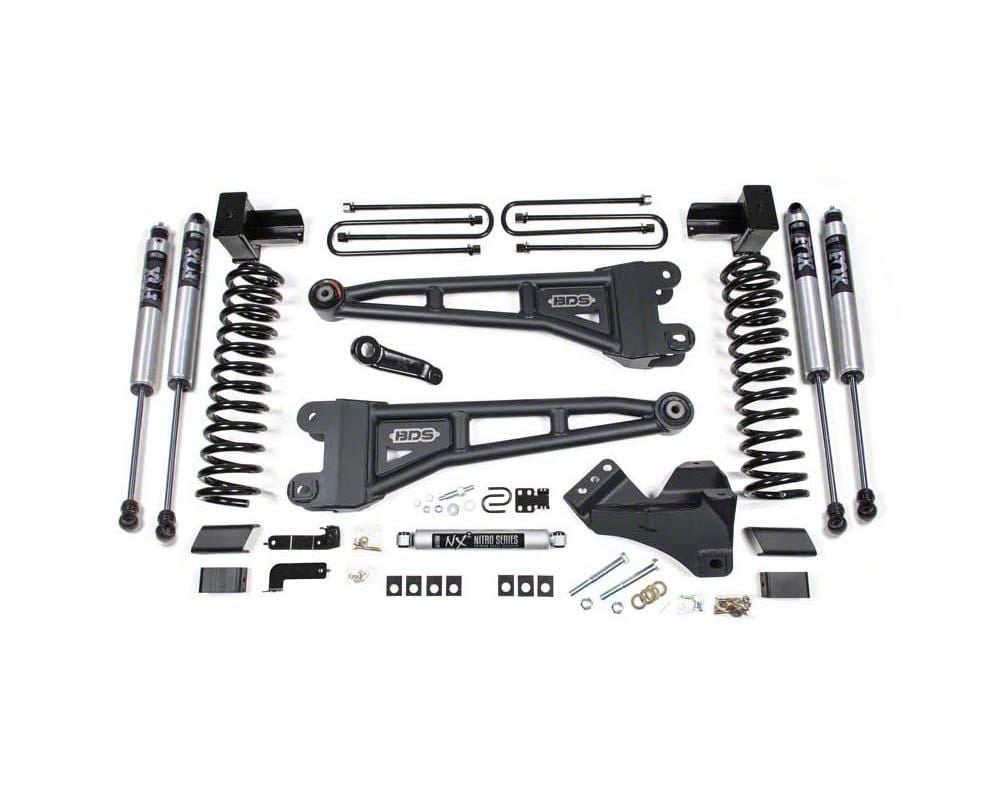 High Performance Lift Kit with Shocks. Take on the high-way and the trail in your F-250 with this BDS 4-Inch Radius Arm Suspension Lift Kit with FOX 2.0 Shocks. It features a pair of tubular radius arms with enhanced strength and improved caster adjustment over your thin factory stamped steel arms. This kit uses ProRide coil springs paired with FOX 2.0-series gas shocks for better on and off-road handling.