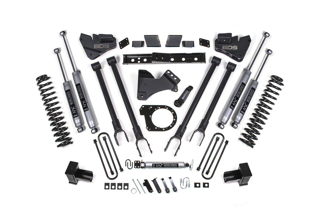Maximum Performance And Durability. The BDS 6-Inch 4-Link Suspension Lift Kit With 5-Inch Rear Lift Blocks And NX2 Nitro Shocks is designed to maximize your Ford F-250 Super Duty's on-road and off-road performance. This comprehensive kit improves handling, control, and drivability, offering the necessary height for larger tires and better ground clearance while maintaining a smooth ride.