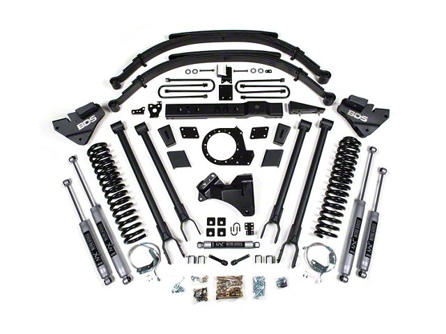 Maximum Performance And Durability. The BDS 8-Inch 4-Link Suspension Lift Kit With Rear Leaf Springs And NX2 Nitro Shocks is designed to maximize your Ford F-250 Super Duty's on-road and off-road performance. This comprehensive kit improves handling, control, and drivability, offering the necessary height for larger tires and better ground clearance while maintaining a smooth ride.