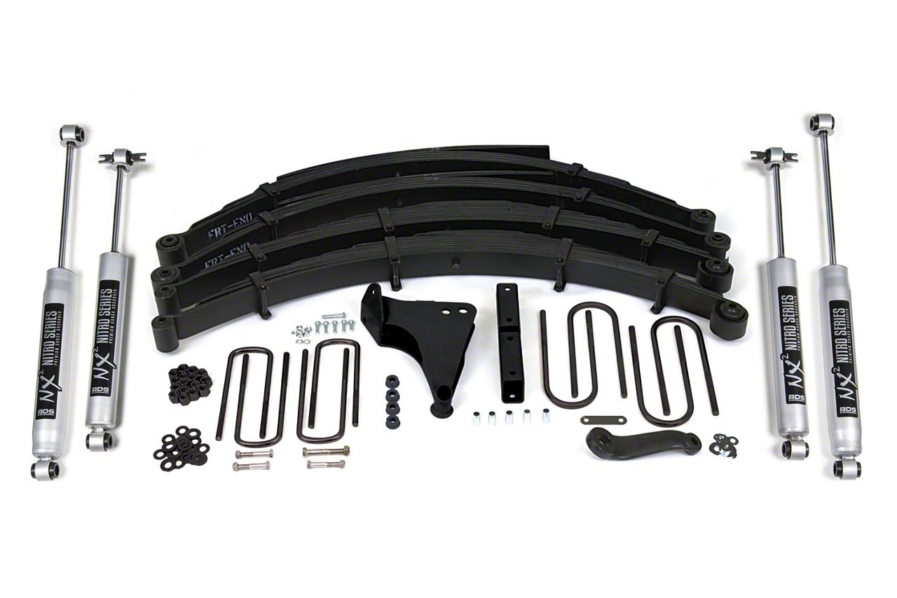 Application. This BDS 8-Inch Leaf Spring Suspension Lift Kit fits 1999-2004 4WD F-250 models with front square U-bolts.