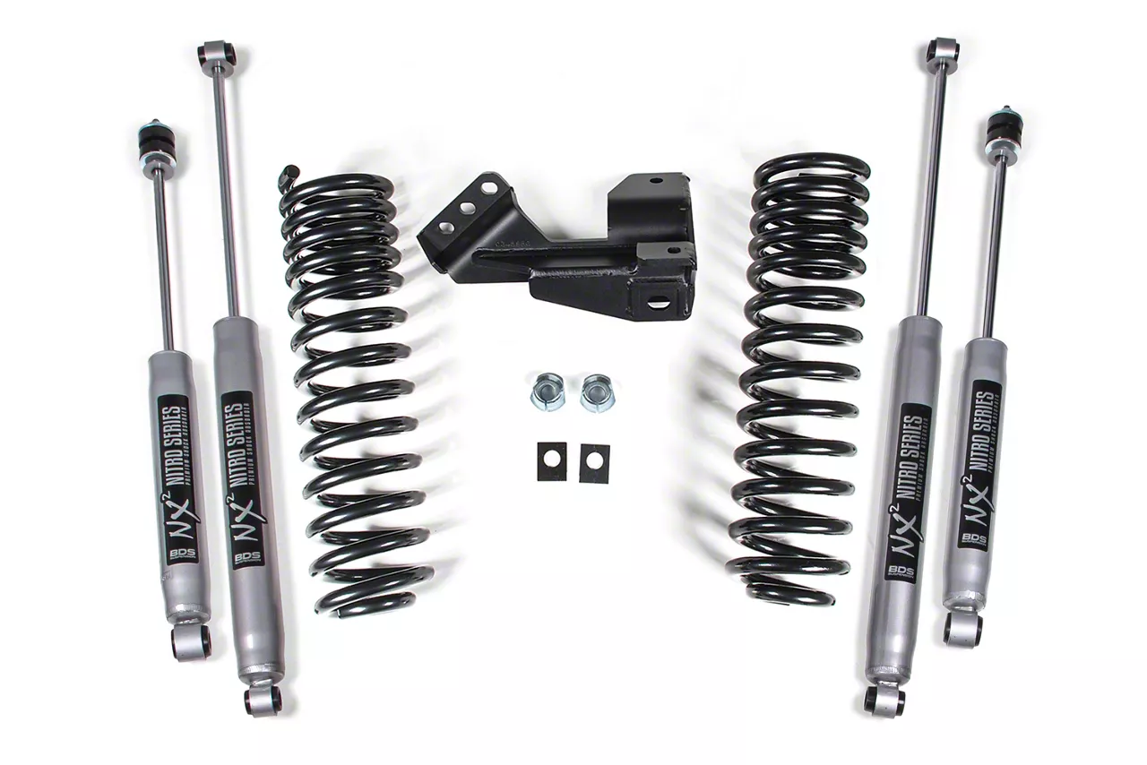 Application. The BDS 2-Inch Front Coil Spring Leveling Kit with NX2 Nitro Front and Rear Shocks fits 2017-2022 4WD F-350 Super Duty models.
