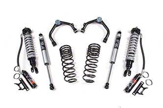Quality Components. To complement the FOX 2.5 DSC Coil-Overs, this suspension lift kit also includes FOX 2.0 Shocks. These shocks are built with precision-machined aluminum bodies, which dissipate heat more efficiently and reduce the overall weight of the vehicle. The FOX 2.0 Shocks also feature a monotube design that provides superior oil flow and eliminates aeration. This kit also comes with a pair of Upper Control Arms made of thick 1.5-inch DOM tubing. These UCAs are made for improving your ride’s strength and suspension travel
